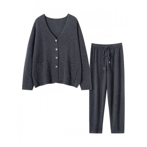秋冬新款女士V领毛衣开衫宽松休闲裤子时尚纯色100纯羊绒套装